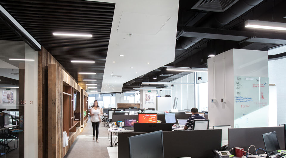 Para generar el efecto de mayor sensación de altura en los espacios, se instalaron cielos falsos solo en el sector anexo al núcleo, dejando en el resto de la oficinas las instalaciones a la vista.
